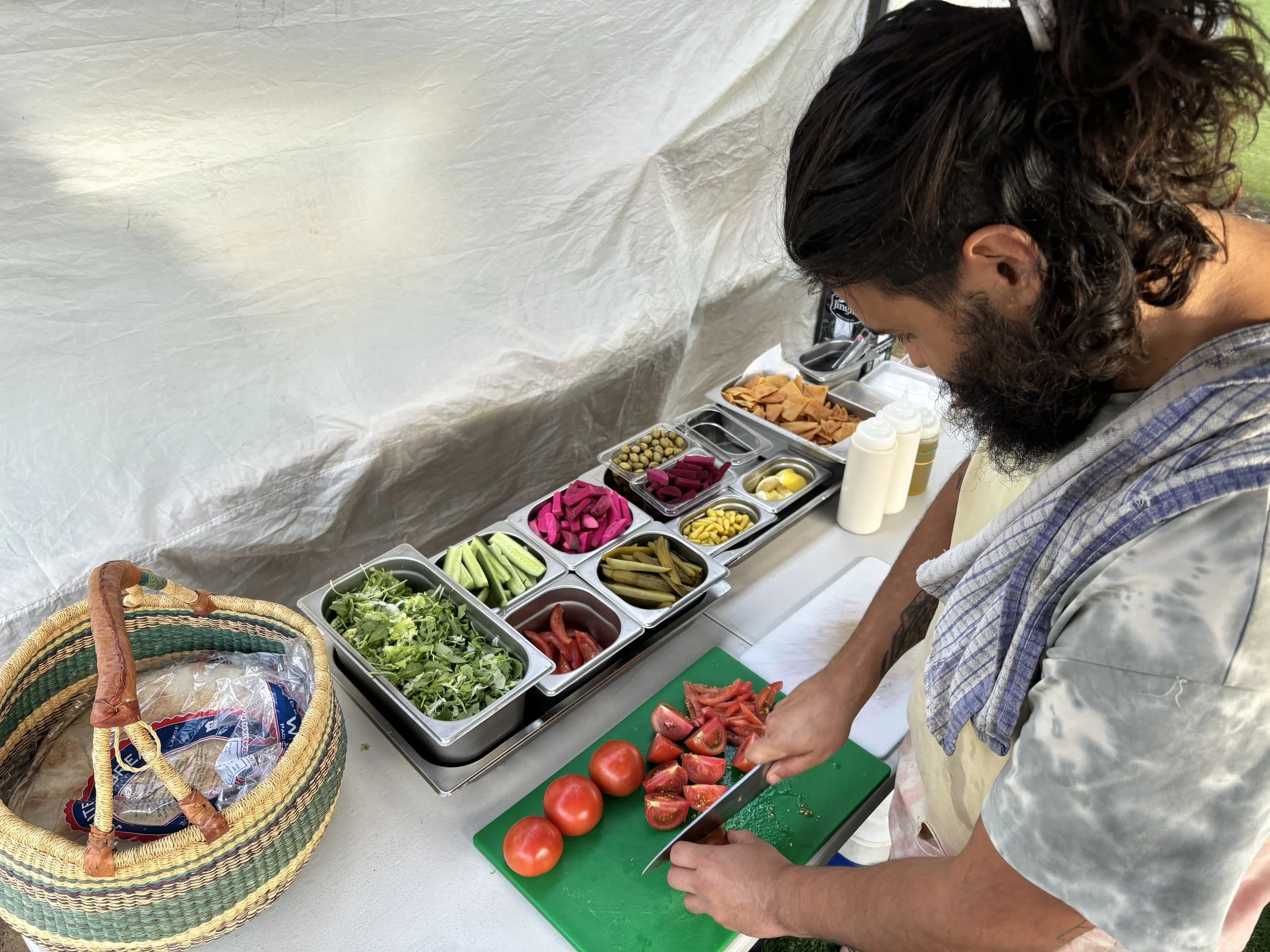 Quite often someone will comment on the weather and let you know if you should put up the awning for the rain, or use the tent pegs for the wind or have extra water for the forty degree day ahead. It’s the Sunday morning ritual of arranging all the weeks mouneh along the trestle table - vibrant orange, purple and pink pickles gleaming in the morning sun. Hummus jars and toum, fragrant ma’amouls and the weeks specialty desert. Firing up the pizza oven and chopping the fresh produce from Margaret River Fresh for the days felafel wraps. Having chats with the regulars who come before the offical opening time and getting a much needed coffee from the van before service. Working here has become more than just a job, it’s a way of life.
